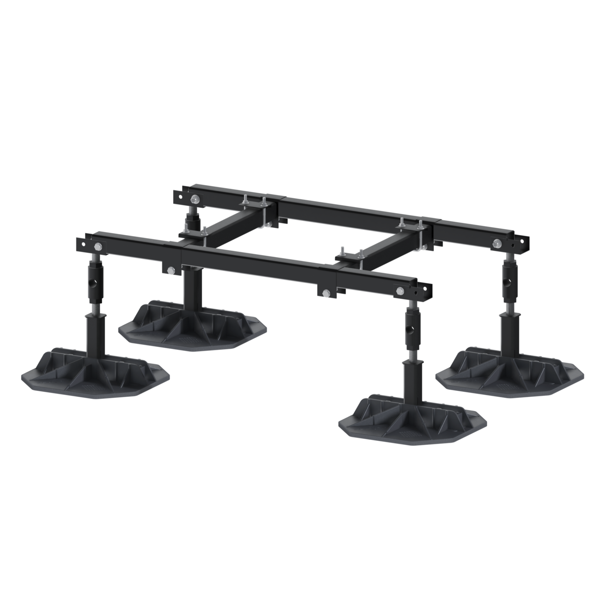 EcoFrame 24" is a lineup of pre-engineered non-penetrative equipment stands designed to support VRF/VRV equipment on flat roof surfaces. The modular design connects lengthwise to support multiple configurations. Each leg is height adjustable. Steel is rust protective and powder coated. Available in 4', 5', 6' sections, with 2' cross bars. EcoFrame 24" is commonly used to support mini-split units. Either in rows, or in back to back configurations.