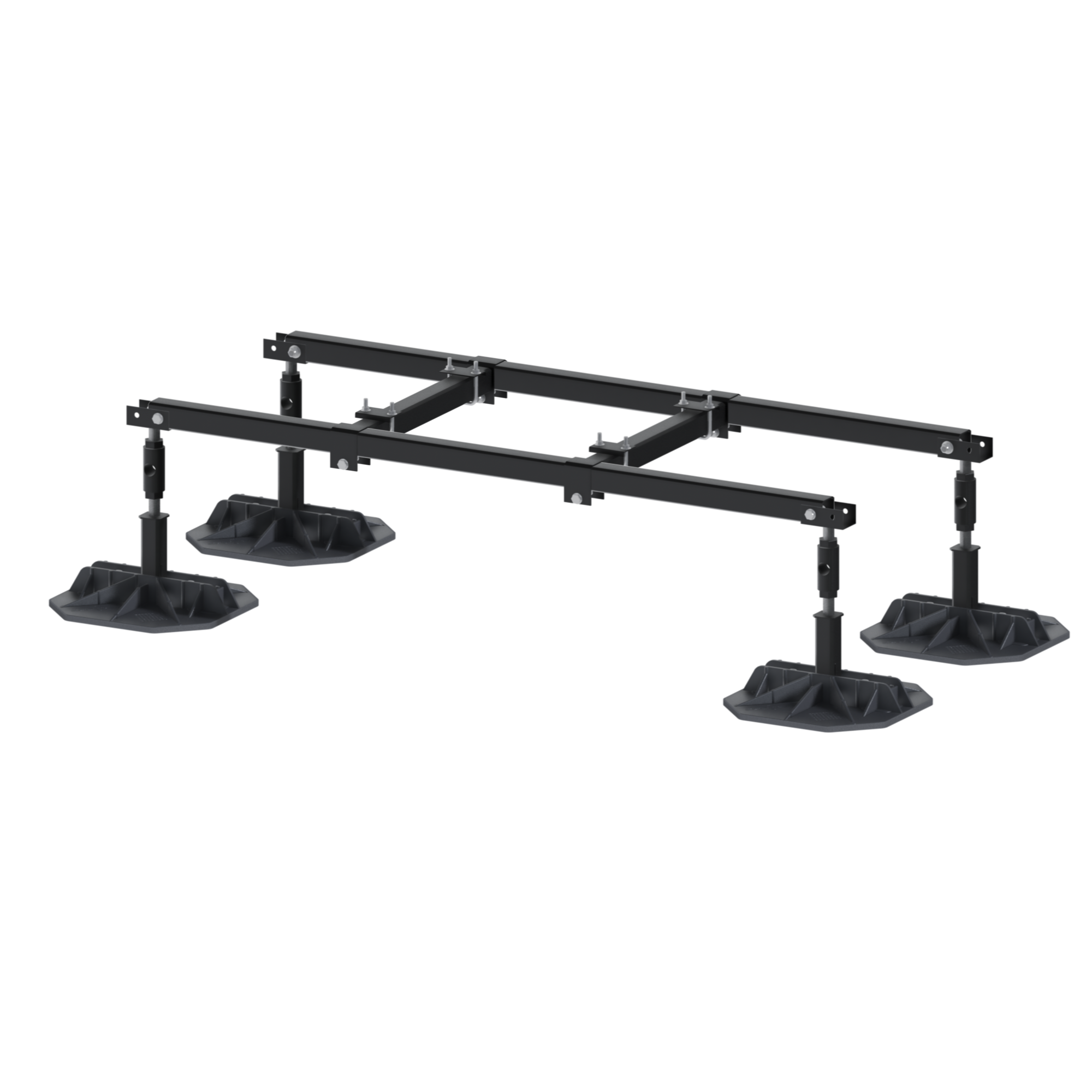 EcoFrame 24" is a lineup of pre-engineered non-penetrative equipment stands designed to support VRF/VRV equipment on flat roof surfaces. The modular design connects lengthwise to support multiple configurations. Each leg is height adjustable. Steel is rust protective and powder coated. Available in 4', 5', 6' sections, with 2' cross bars. EcoFrame 24" is commonly used to support mini-split units. Either in rows, or in back to back configurations.