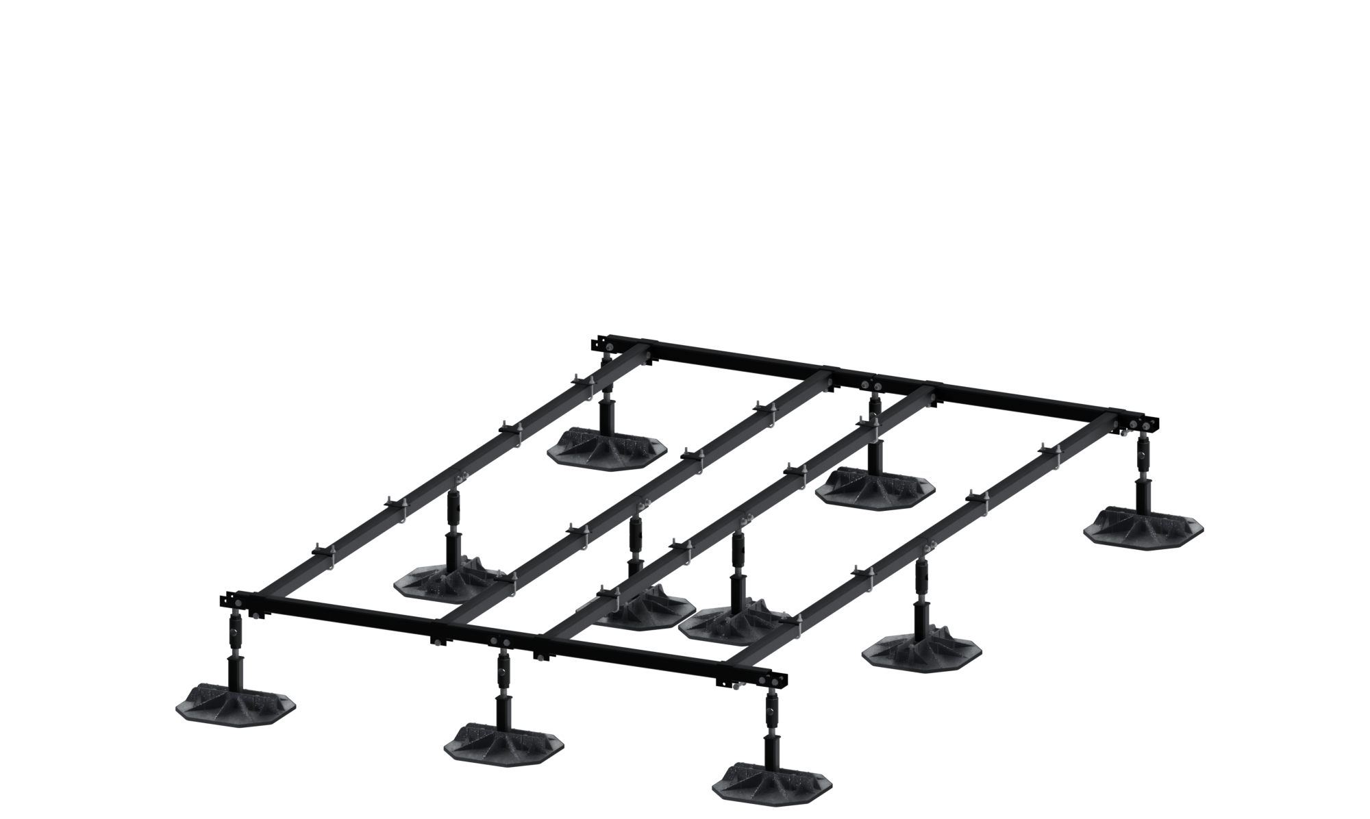 FlexFrame 144" is a lineup of pre-engineered non-penetrative equipment stands designed to support large rooftop equipment on flat surfaces. The modular design connects lengthwise to support multiple configurations. Each leg is height adjustable. Steel is rust protective and powder coated. Available in 4', 5', 6' sections, with 12' cross bars. FlexFrame 144" is commonly used to support VRF/VRV equipment back to back. As well as side discharged AHU's and Chillers.